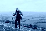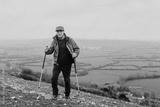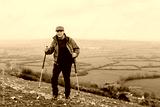 Elderly man hiking with poles on grass hill. Outdoor activity in nature. Senior enjoying hiking in nature landscape. Scenic landscape. Senior man hiking, outdoor activity in nature grass hill
