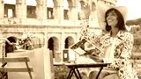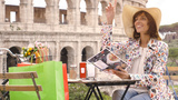 Beautiful young woman tourist sitting at the table of a bar restaurant in front of the Colosseum in Rome calls the waiter and orders food and drinks. Elegant dress with large hat and colorful shopping