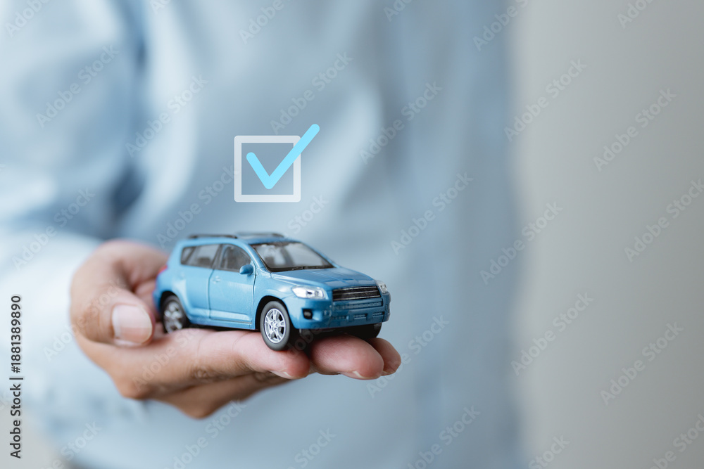 Hand holding miniature car with approval checkmark, representing car purchase, vehicle agreement, auto insurance, leasing, and financial decision making in automotive business and dealership services.