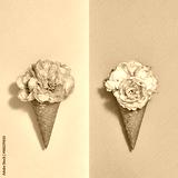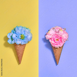 Ice Cream Cone Set with Flowers. Creative Minimal. Trendy fashion Yellow Purple Style. Spring Summer Floral concept. Colorful Neon Design. Pop Art