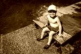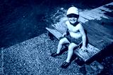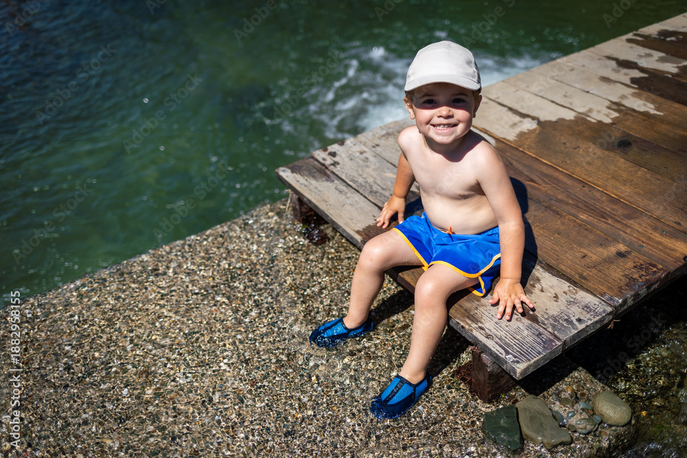 Happy and smiling child rests after playing by the river on a hot summer day
