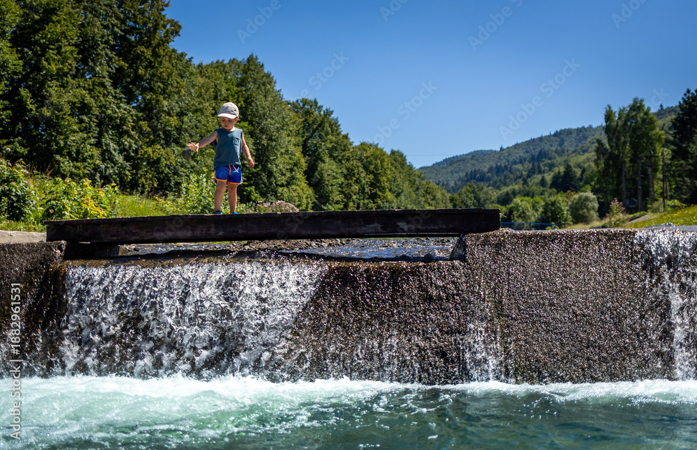 Child walks near a waterfall on a mountain stream, vacation time in the mountains during the summer