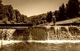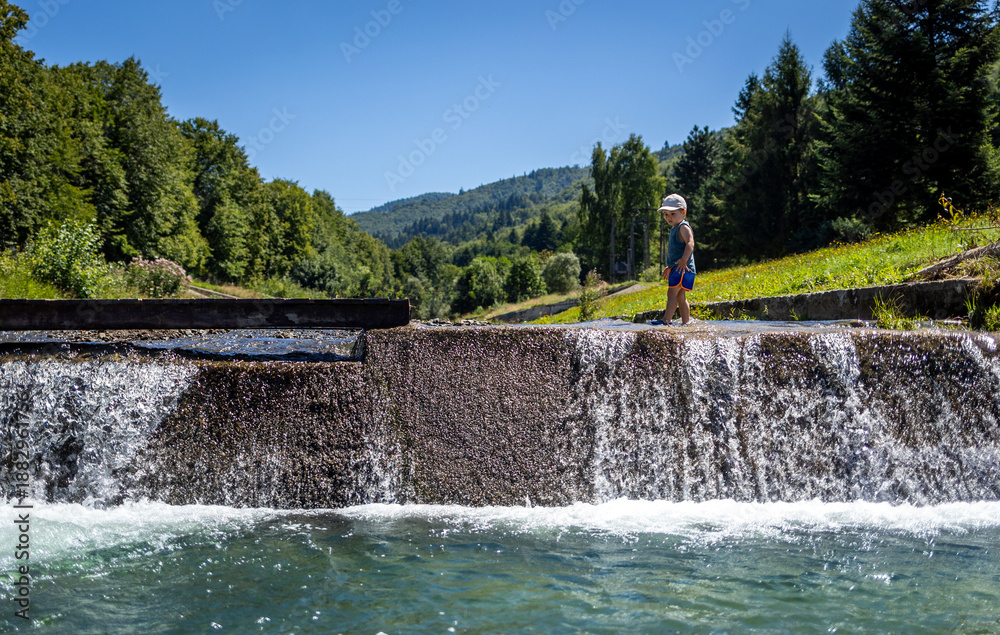 Child walks near a waterfall on a mountain stream, vacation time in the mountains during the summer