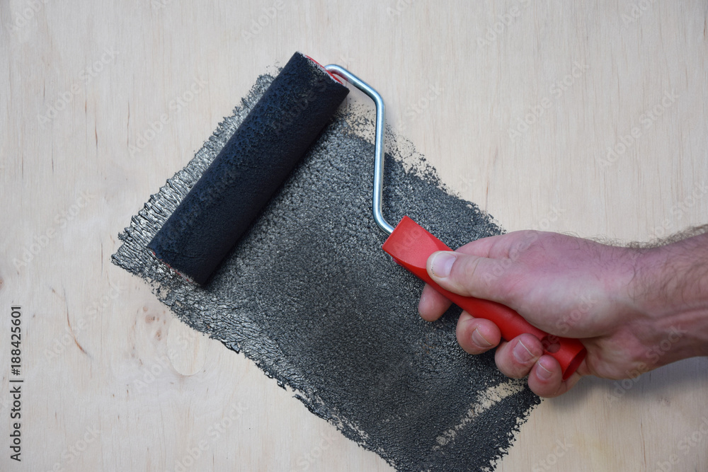.painting of a wooden plane with a brush roller in black color. The man performs painting work