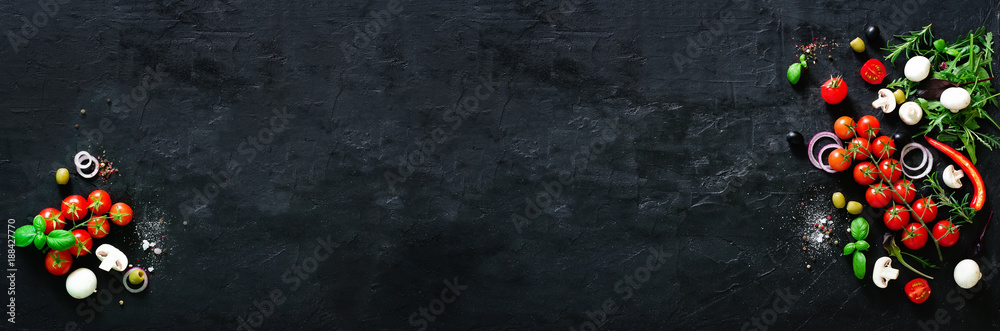 Fresh vegetables, herbs, onion, mushrooms, basil and spices on black background. Copy space