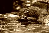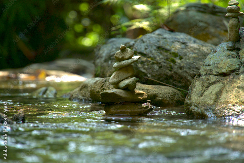 A Zen symbol in the form of a stone pyramid stands majestically in the middle of a river amidst a lush natural forest.