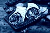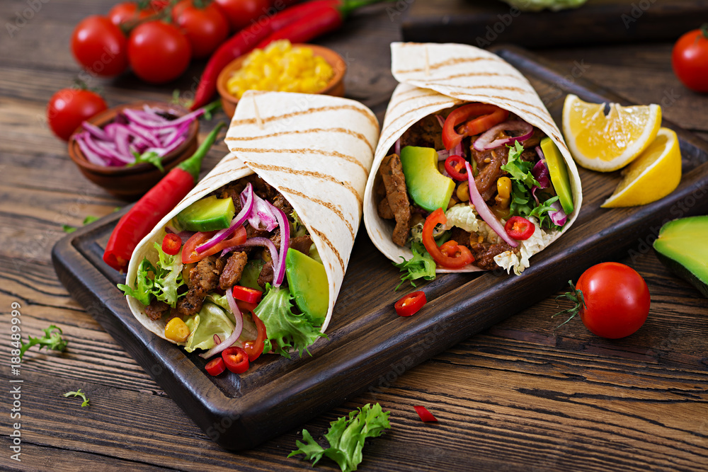 Mexican tacos with beef in tomato sauce and avocado salsa