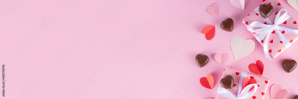 Cute pink background for Valentine Day. Valentines greeting card flat lay with gifts box with ribbons, chocolates and heart decor top view copy space