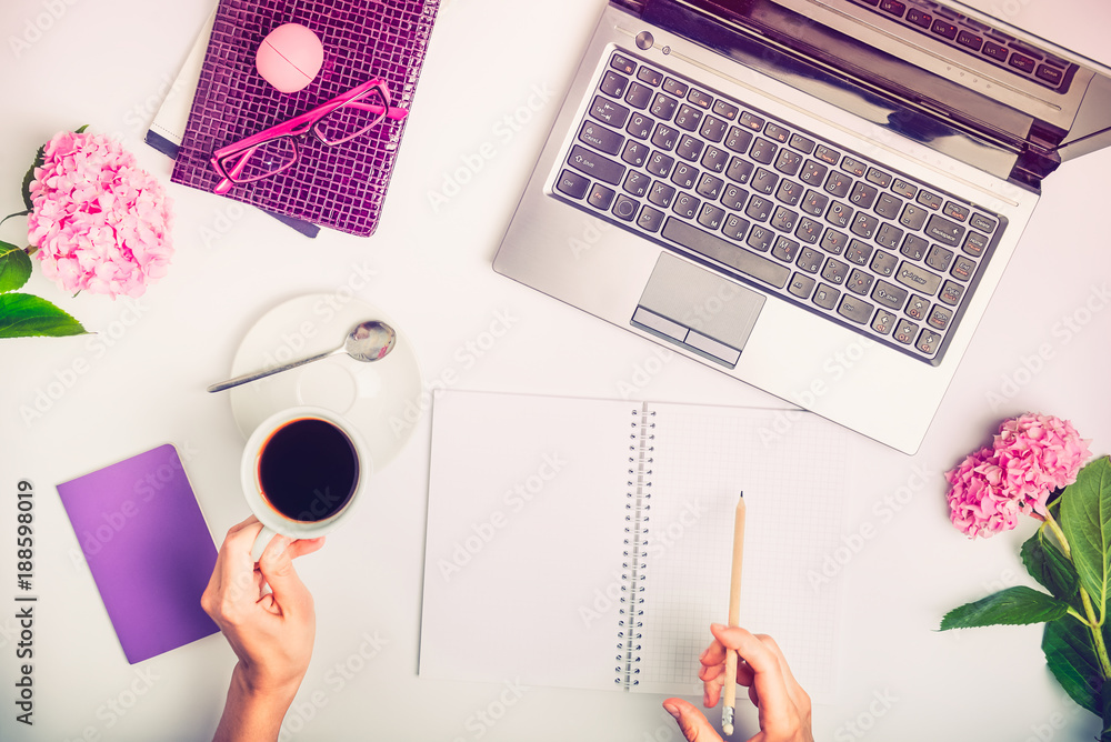 Workspace with laptop, girl's hands writing in notebook, glasses, cup of coffee and wisteria flowers on white background. Top view feminine office table desk. Freelancer working place.