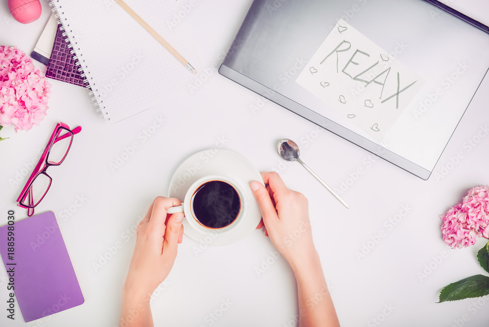 Coffee break time on the workspace - female hands with cup of coffee on the white working office desk with laptop, notebook, glasses, and wisteria flowers. Freelance.