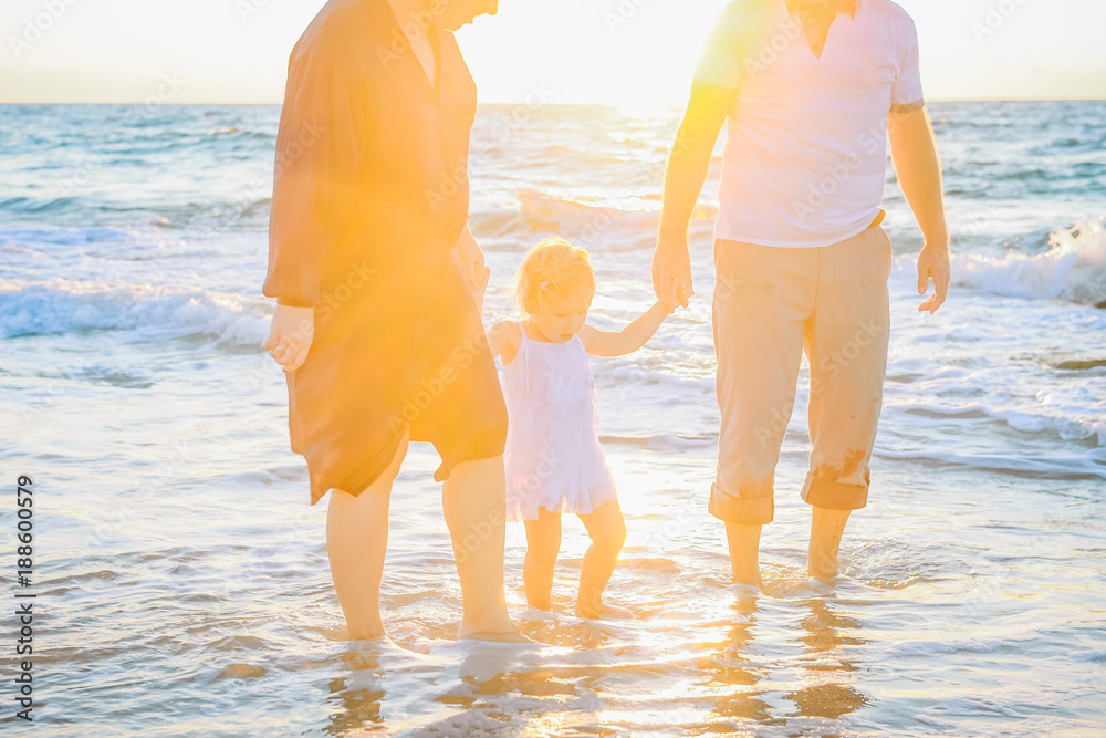 Close up Happy family of three - pregnant wife, father and daughter having fun walking on beach at sunset. Family traveling concept. Backlight, soft selective focus. Copy space.