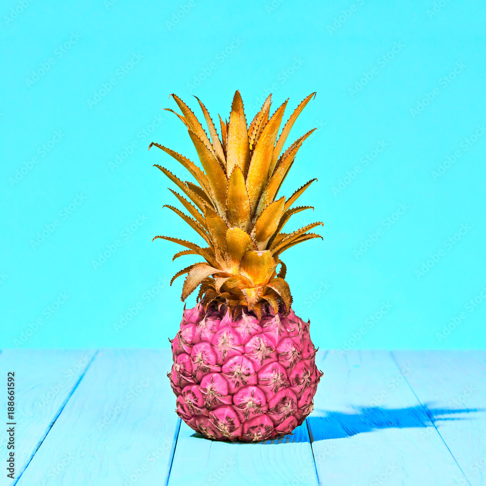 Tropical Pineapple Fruit. Bright Summer Color. Creative Minimal. Hot Summer Vibes. Pink Yellow pineapple on Sunny background. Trendy fashion Style. Pop Art