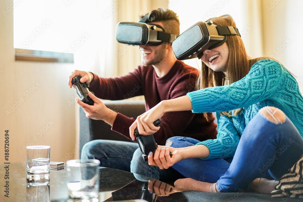 Happy friends playing video games wearing virtual reality glasses in their apartament