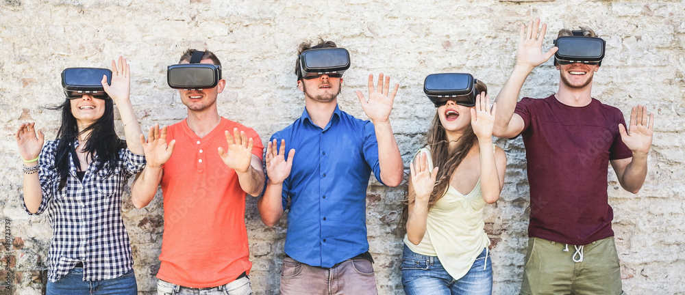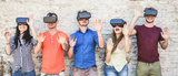 Young students wearing virtual reality glasses outdoor - Happy people having fun with new technology vr headset goggles - New generation mania trends concept