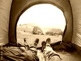 Legs view of happy couple inside tent camping in landscape mountain