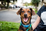 Portrait of a little brown dog outside in a neighborhood with a person sitting nearby.