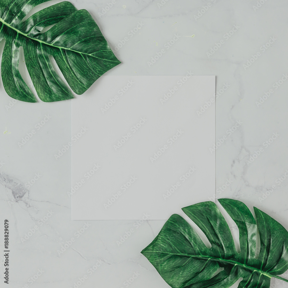 Creative natural layout made of tropical leaves on marble background. Flat lay composition.
