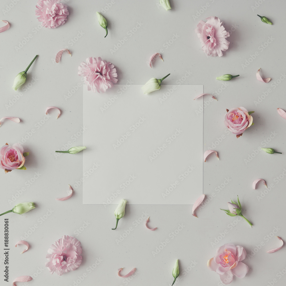 Creative pattern made of violet and pink flowers with paper card copy space. Flat lay. Minimal season background.