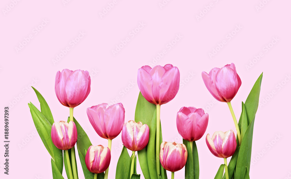 Delicate pink tulips with fresh green leaves are arranged against a pastel pink background, creating a soft and elegant floral composition. Perfect for spring or romantic themes.