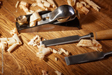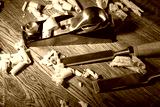DIY concept. Woodworking and crafts tools. Carpentry hand tools. Planers, chisels, measuring tools. Wooden background.