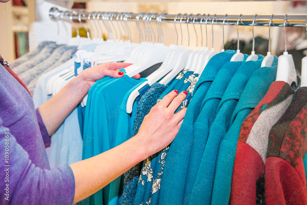 Close up female hands searching through hangers with clothes in store, showroom. Shopping Mall. Shopper. Sales. Shopping Center. Selective focus.
