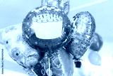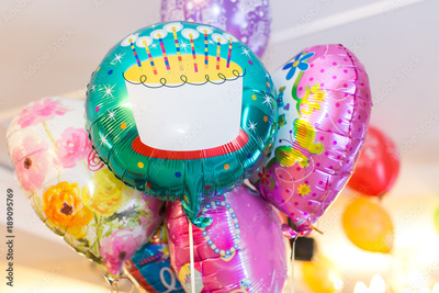 celebration, birth, amusement concept. there are bunch of huge and shining balloons of different coloures that are floating on the ceiling, one has paint of birthday cake
