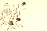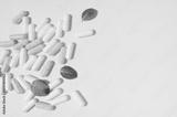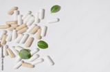 Tablets, capsules, vitamins, and dietary supplements and green leaves on white background. Minimalistic medical background. Concept of health, pharmaceuticals, disease prevention