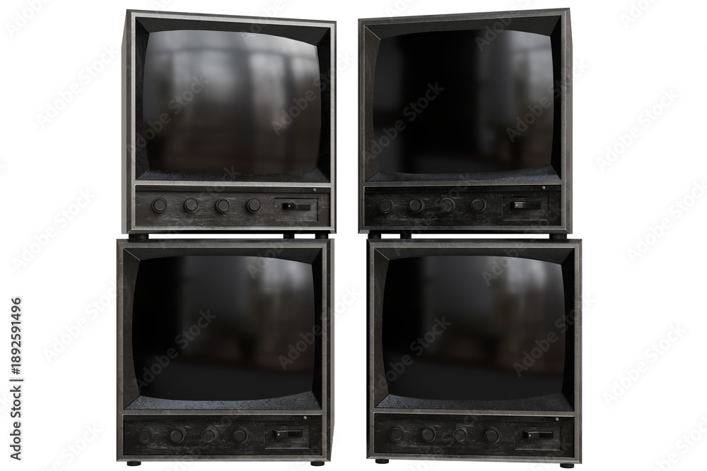 dark-screened CRT televisions with control knobs. Reflective surfaces hint at a dull, retro tech presence
