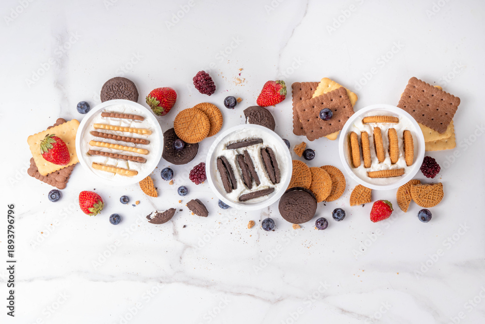 Set of different trendy yogurt and cookie dessert. Simple two ingredient japanese yogurt cheesecake, viral tasty quick recipe made with greek yogurt, various biscuits and berries