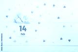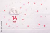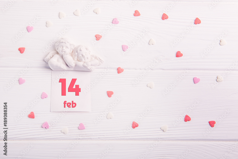 Top view statuette of two little lovely angels with card with 14 febuary date on the white wooden background with multicolor sweet hearts. Valentine's day concept.