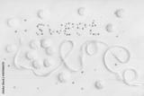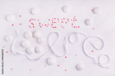 Sweet Love lettering by white ribbon, merengue sweets and multicolor candies in shape of heart on the white wooden background. Love expression. Valentine's day.