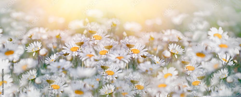 Daisy flower, flowering daisy flowers in meadow, beautiful landscape in spring