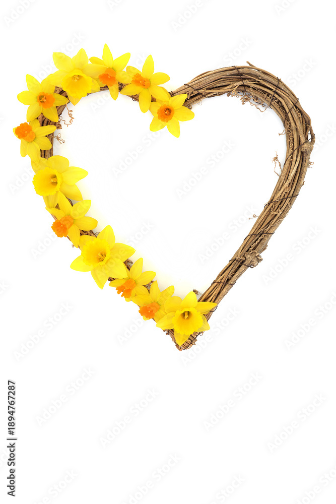 Romantic abstract heart shape daffodil narcissus flower woven wreath on white. Spring season, floral symbol of love for Mothers Day, anniversary, birthday card.