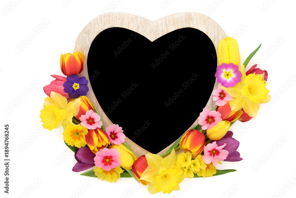 Spring flowers heart wreath frame colorful design on white background with chalkboard. Romantic seasonal symbol for Easter and Spring. Copy space.