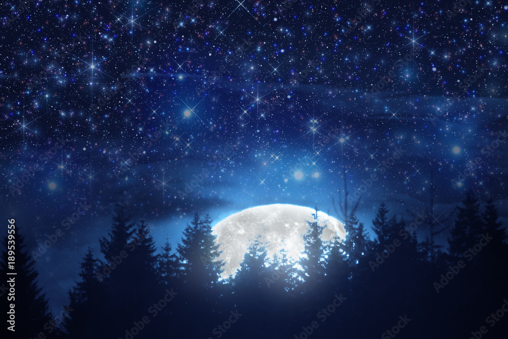 Full Moon rising from the horizon with tree silhouettes and stars.