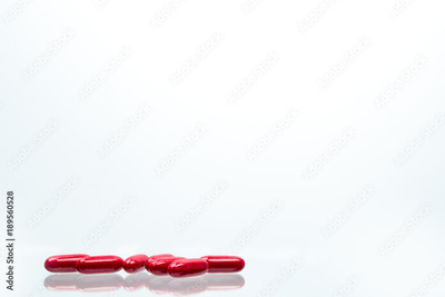 Red capsule pills isolated on white background with shadows and copy space for text. Vitamin and supplement for pregnancy and elderly people.