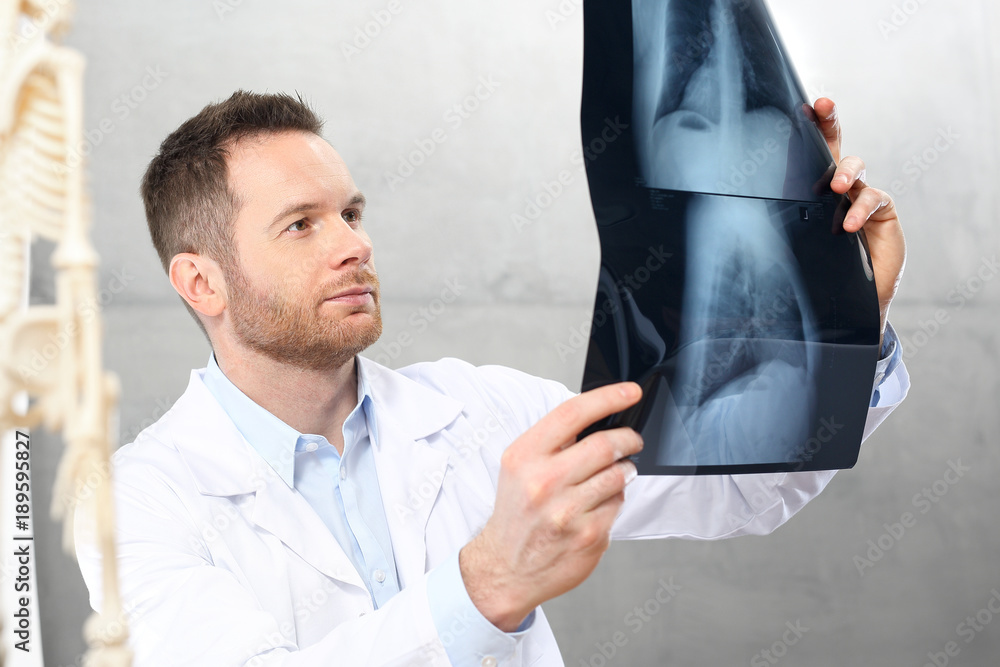 Ortopeda. Lekarz w gabinecie lekarskim ogląda zdjęcie rentgenowskie pacjenta.