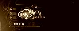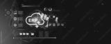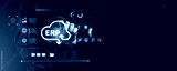 ERP system cloud integration with digital interface icons and business automation concept on futuristic technology background.