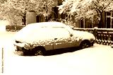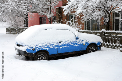 Photo of a car covered in a thick layer of snow. Consequences of heavy snowfall