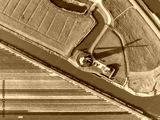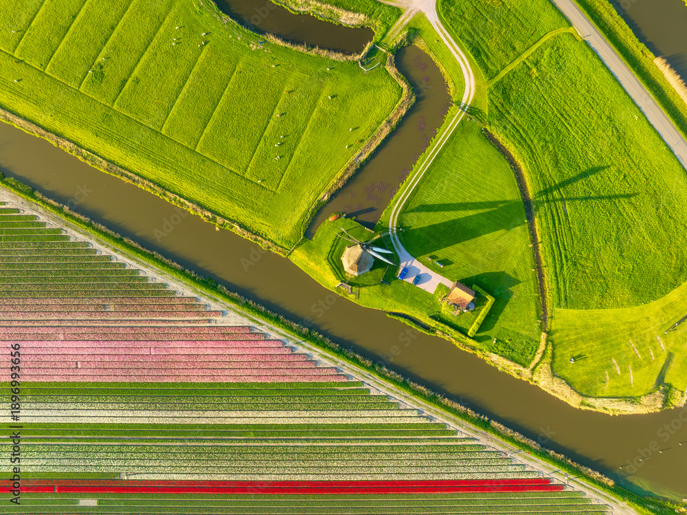 Aerial view of vibrant tulip fields in the Netherlands at sunrise. Traditional Dutch windmill stands by a calm canal. Symmetrical rows of colorful flowers creating a stunning geometric pattern.