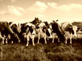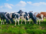 Domestic cows graze on a lush green meadow under a bright blue sky with clouds. Scenic rural landscape of a dairy farm in the countryside. Sustainable agriculture and livestock concept.