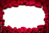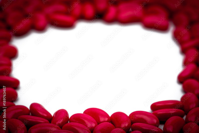 Selective focus of red kidney shape sugar coated tablet pills on white background with copy space