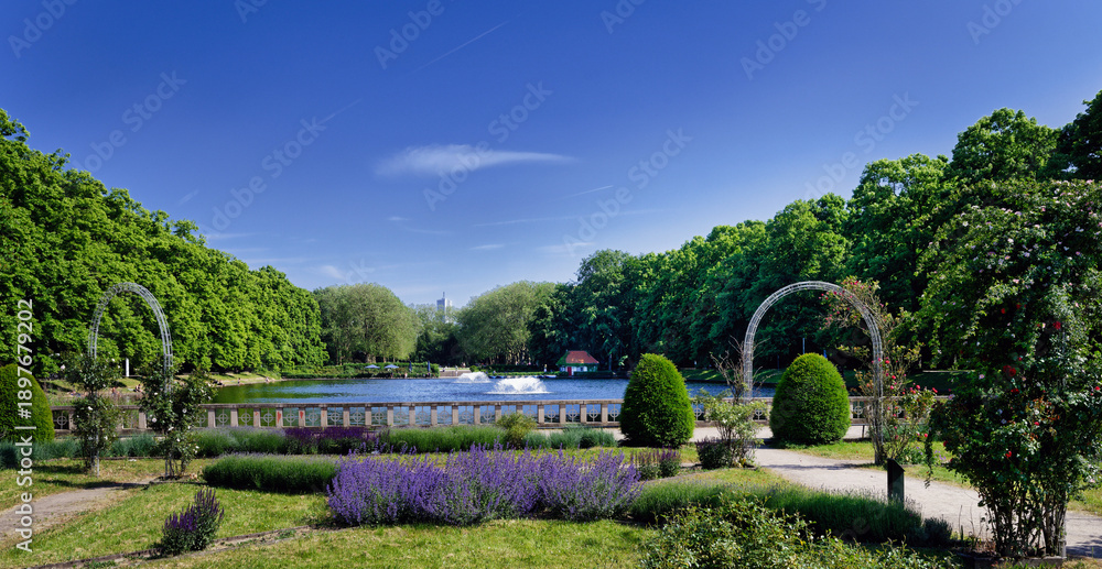 Symmetrical garden design in Cologne's Bluecherpark featuring a pond, fountains, and lavender blooms under a blue sky. Historic landmark park, Germany.