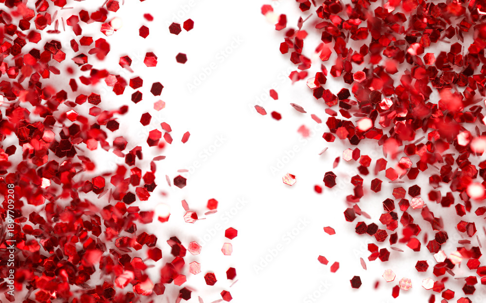 Mess of shiny red glitter scattered on white. Splatter of falling metallic confetti flakes creating messy border of sparkling glitter. Real shiny red glitter dots for messy festive party backgrounds.