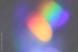 Colorful spots of reflected sunlight. Rainbow reflection light prism effect on light background. Hologram glass dispersion, crystal flare leak shadow overlay.