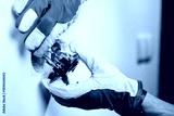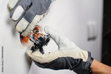 Electrician hands wearing protective gloves connecting exposed copper electrical wires to wall light switch. Concept of electrical safety, professional repair, home renovation and maintenance