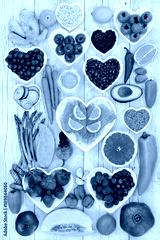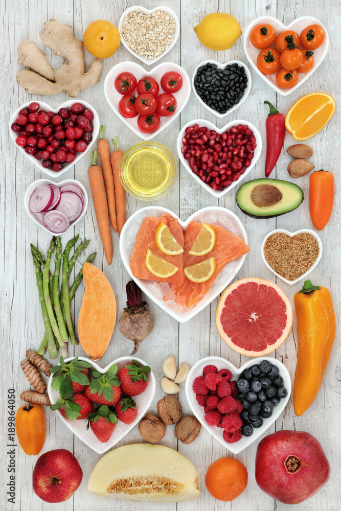 Health food for a healthy heart with vegetables, fruit, fish, nuts, seeds, supplement powders, pulses, cereals, spices and herbs used in herbal medicine. High in omega 3, anthocyanins & antioxidants