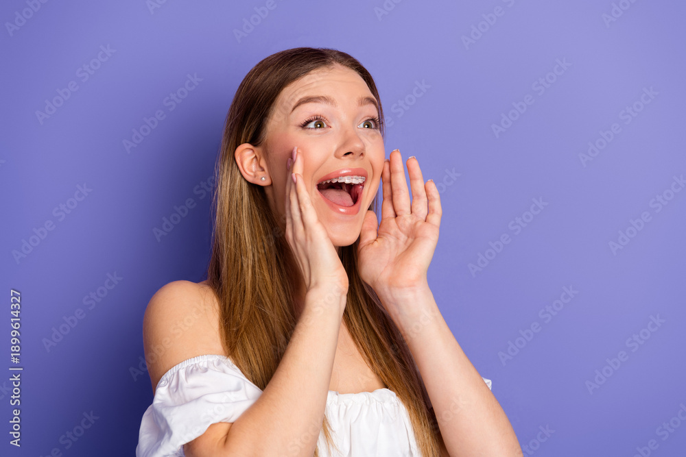 Excited young woman gesturing on purple background, promoting fun and trendy lifestyle ideals in a cheerful demeanor.
