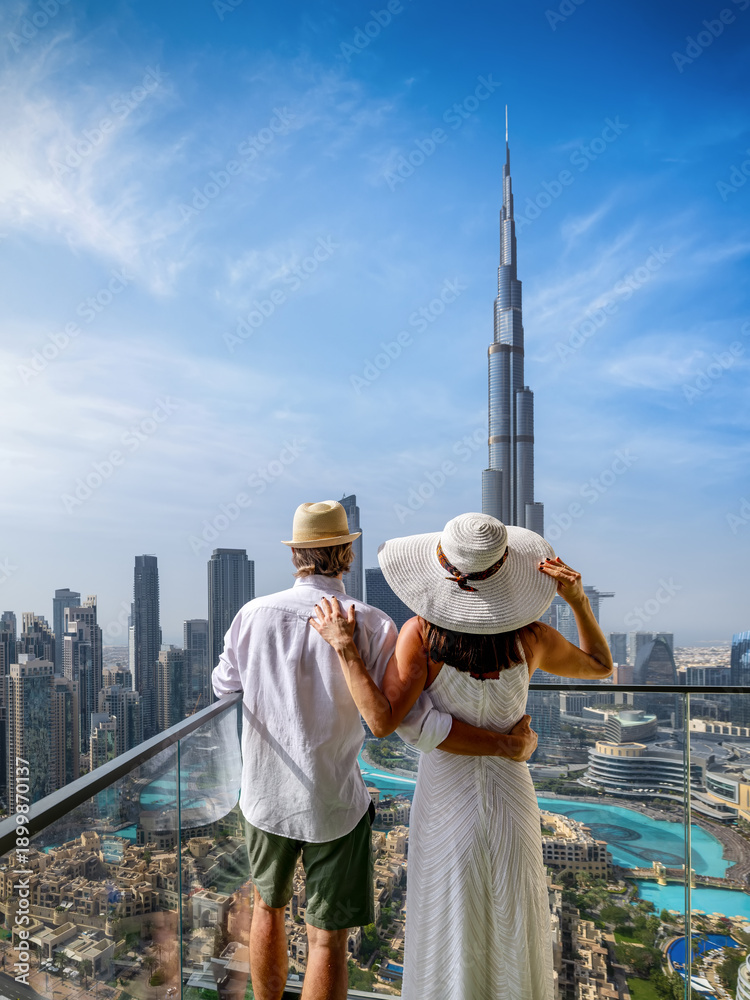 Rear view of an elegant tourist couple looking at the panoramic view of the skyline of Downtown Dubai, UAE, from their balcony