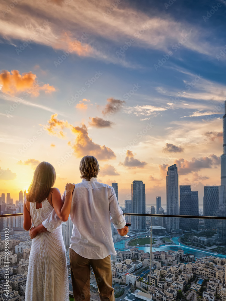 A elegant couple stands on a balcony and enjoys the sunset behind the skyline of Dubai, UAE, with copy space in the sky